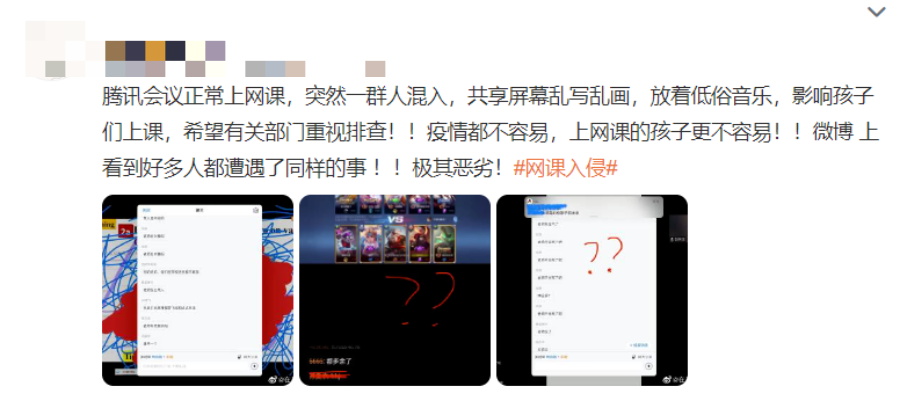 學(xué)生通過(guò)騰訊會(huì)議、釘釘?shù)绕脚_(tái)上網(wǎng)課時(shí),突然有一些陌生人涌入直播間,有人謾罵老師和學(xué)生,有人放哀樂(lè),甚至散發(fā)淫穢色情視頻。