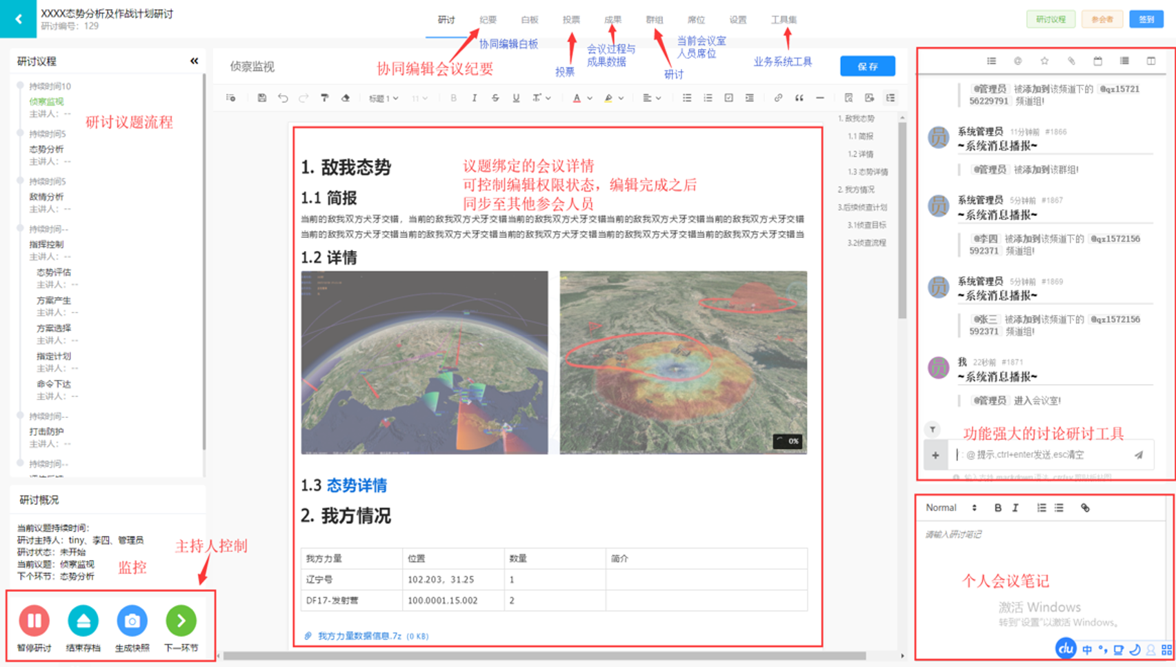 以高層研討廳、低層研討廳、作戰(zhàn)模擬與訓(xùn)練演習(xí)為研究對(duì)象,根據(jù)軍事戰(zhàn)爭(zhēng)需要,以軍事任務(wù)為牽引,組成結(jié)構(gòu)為基礎(chǔ),對(duì)每個(gè)組成部分進(jìn)行功能需求分析,建設(shè)成一個(gè)具有功能相對(duì)完善、結(jié)構(gòu)相對(duì)完整,各部分關(guān)系相互協(xié)調(diào)的研討廳體系。
